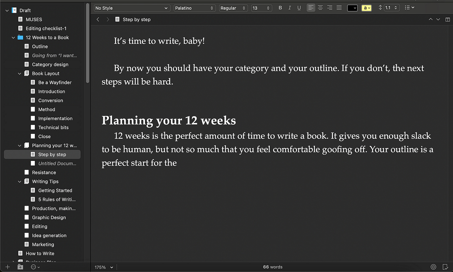 It’s a lot easier to manage than a large Word or Google Doc. I’ve been using Scrivener for over a decade and I still love it. You can outline, write, edit, and compile an entire book in the software. Without nerding out too much, the software also allows you to drag and drop your chapters, so you can move your ideas around. It’s my favorite and it’s pretty cheap.