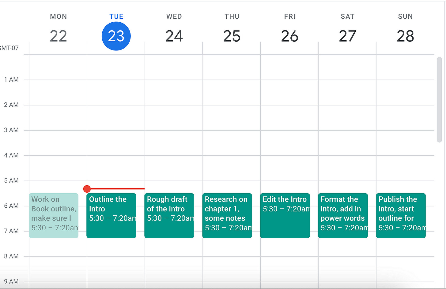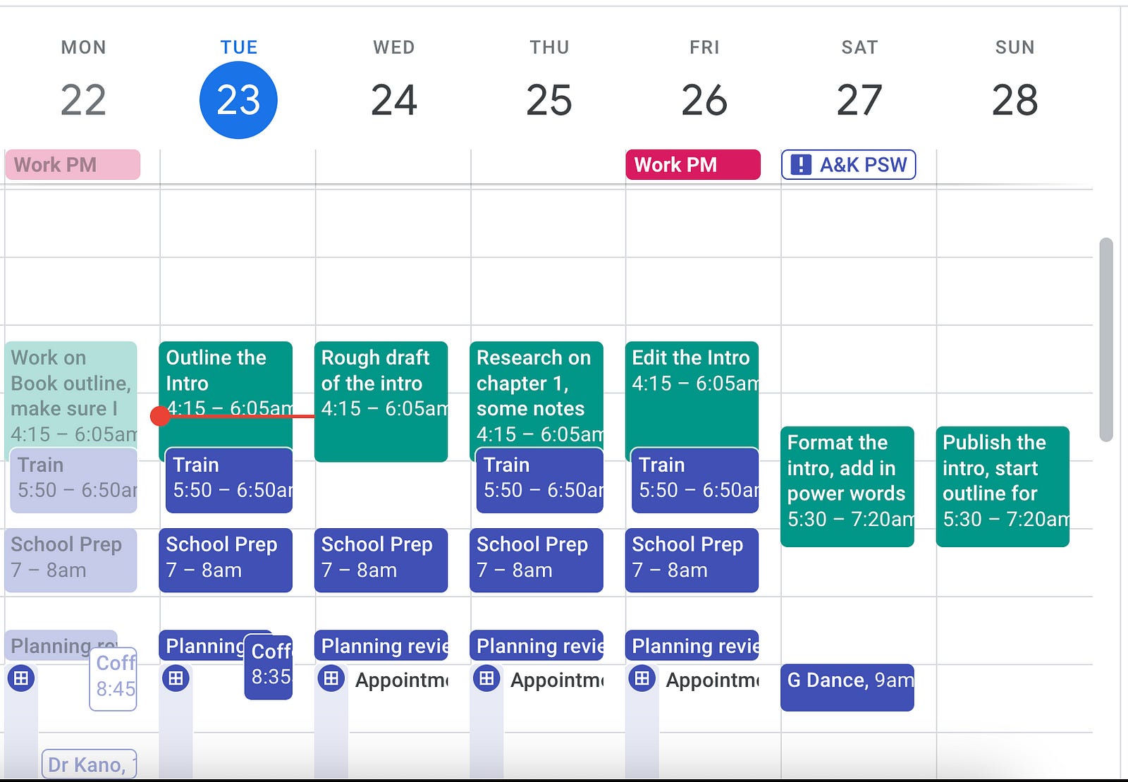 If you like the idea of a calendar to keep you on track, but don’t like the rigidity of having to write what your past self told you to write, you can always quarantine off an hour or two a day. Call it “Writing Time” and then you know when you’re supposed to write. For me it’s 4:30 on weekdays and 5:00 on weekends.