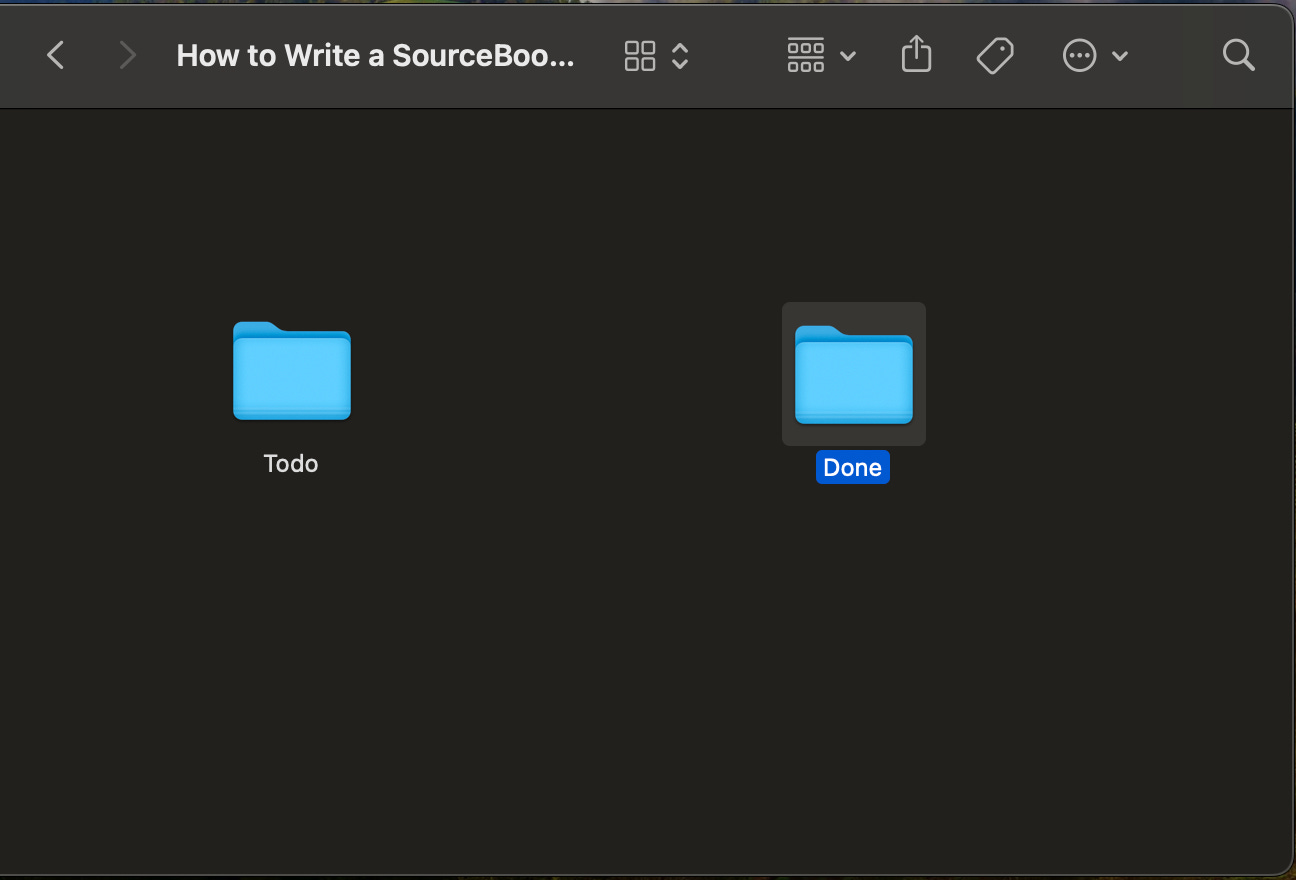 I call this method Documenting. Instead of putting your writing on a calendar, like above, you create a document for each section/chapter you’re going to write. Then you have a “to-do” folder, and a “done” folder. Like this: